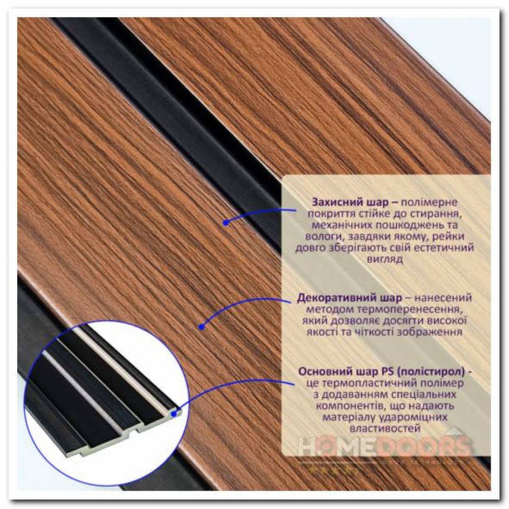 - Защитный слой – полимерное покрытие устойчивое к истиранию, механическим повреждениям и влаге, благодаря ему, рейки долго сохраняют свой эстетический вид.