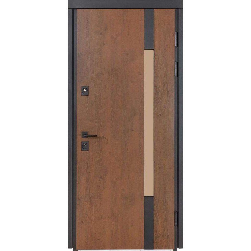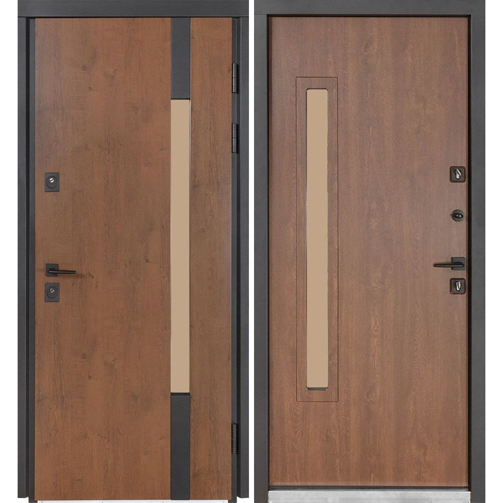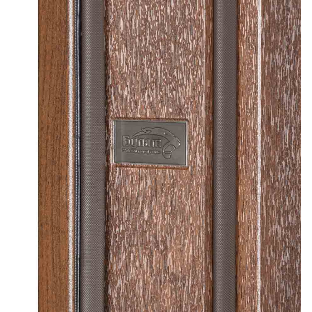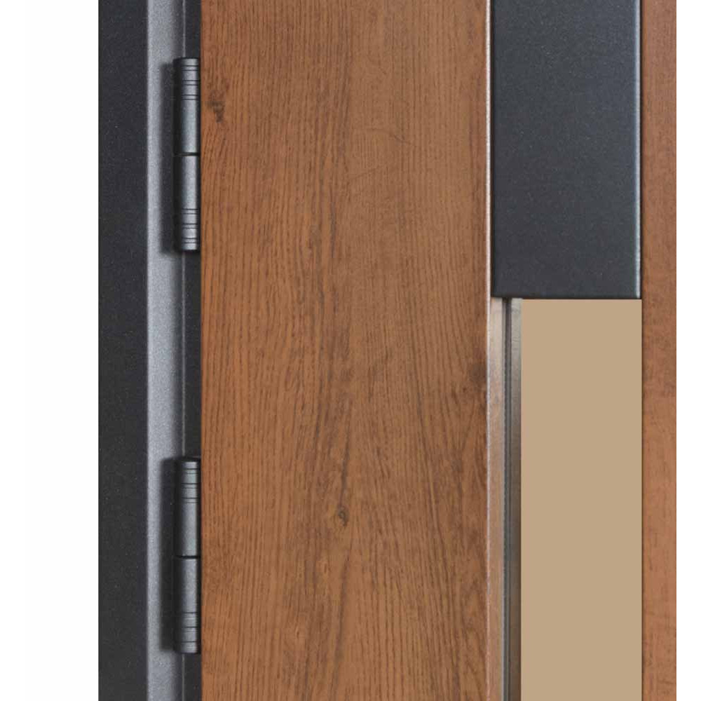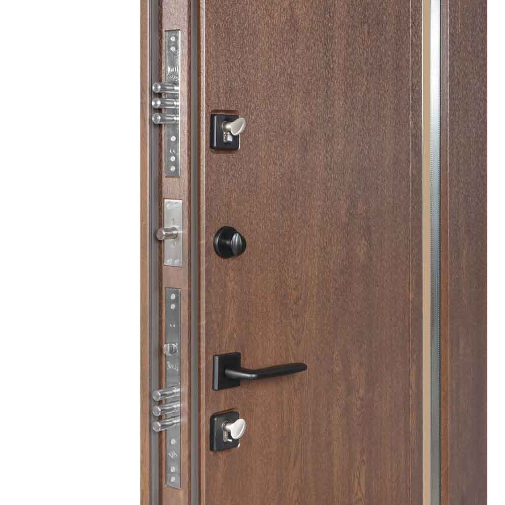 Двері оснащені конусними петлями (d-24/120 мм) і протизнімними ригелями (14 мм). Зовнішнє оздоблення полотна виконано у вигляді сендвіч панелі - це лист металу товщиною 0,8 мм у поєднанні з екструдованим пінополістиролом товщиною 20 мм. Інноваційне покриття включає цинкогрунт для захисту від корозії, захисну фарбу від ультрафіолету і нанесення структури дерева.