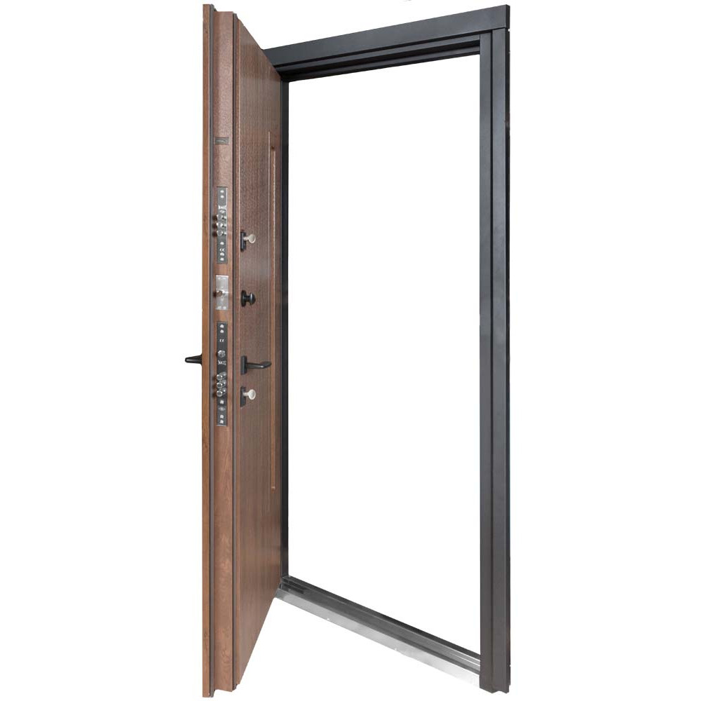 Товщина металу дверного коробу становить 1,2 мм, а посилені отвори для замкових ригелів також виготовлені з металу товщиною 1,2 мм. Теплоізоляція забезпечується за допомогою мінеральної вати та фальгованого утеплювача.