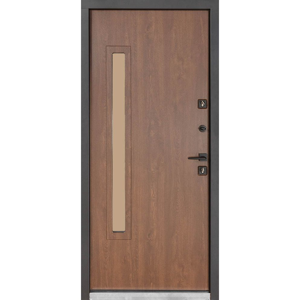Внутрішнє оздоблення полотна включає вологостійкий МДФ товщиною 16 мм і плівку ПВХ Winshield (Ізраїль). Склопакет двокамерний, енергозберігаючий та тонований, з розміром світового проєму 1233x88 мм. Металева лишта шириною 60 мм монолітна із дверним коробом.