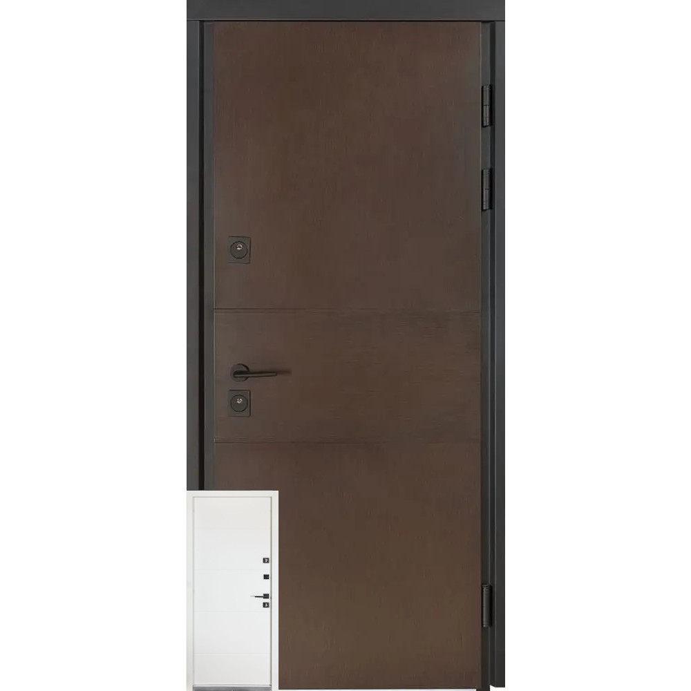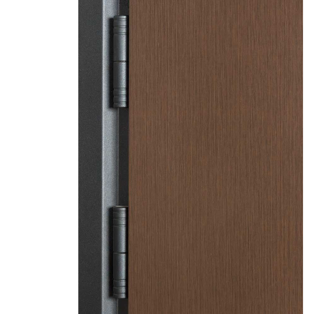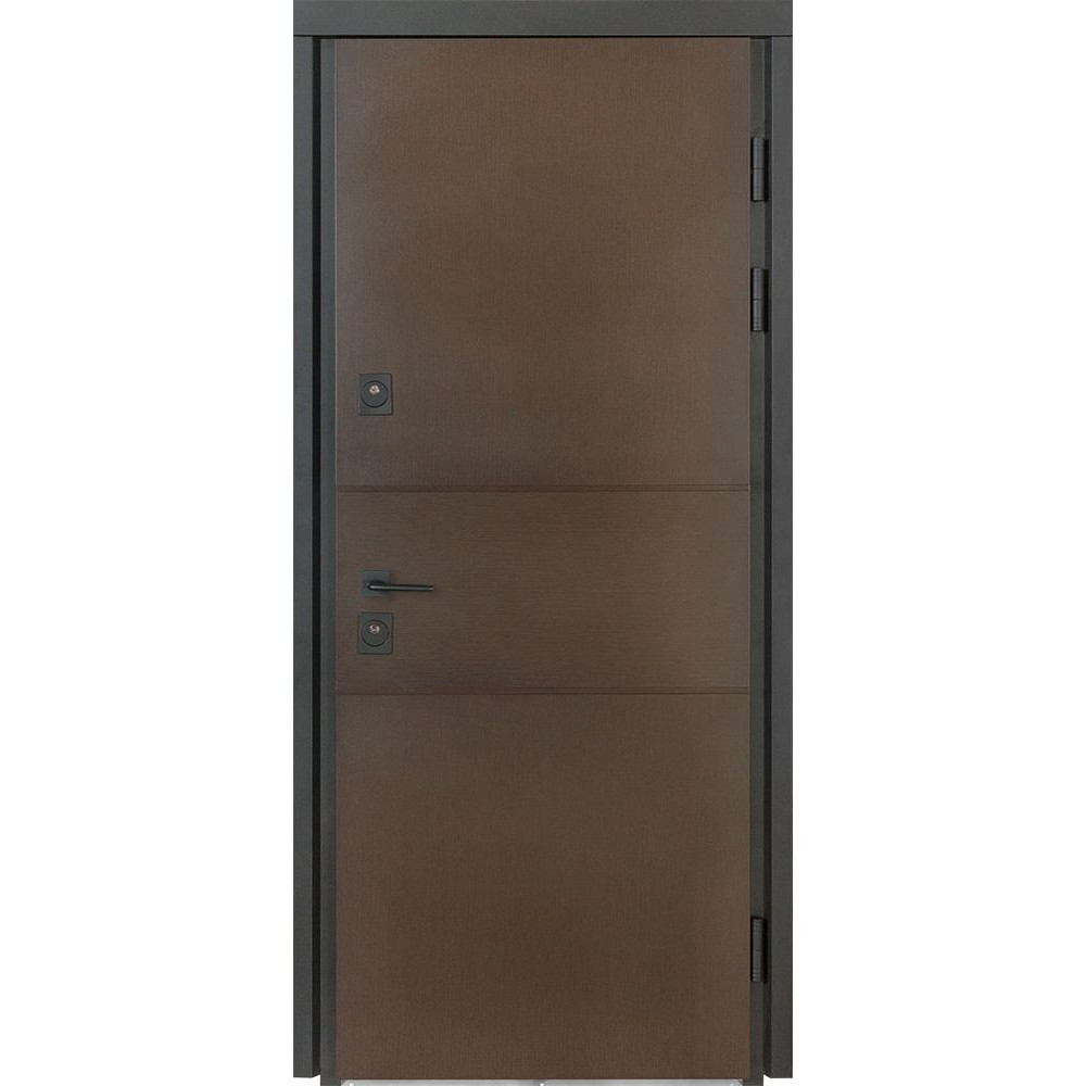Двері виготовлені з мінеральної вати, фольгованого утеплювача та екструдованого пінополістиролу, що забезпечує високий рівень теплоізоляції. Зовнішнє покриття складається з пофарбованого листа металу під текстуру дерева, яке має 3 шари покриття для довговічності та стійкості до ультрафіолету. Внутрішнє покриття включає вологостійкий МДФ з ПВХ.