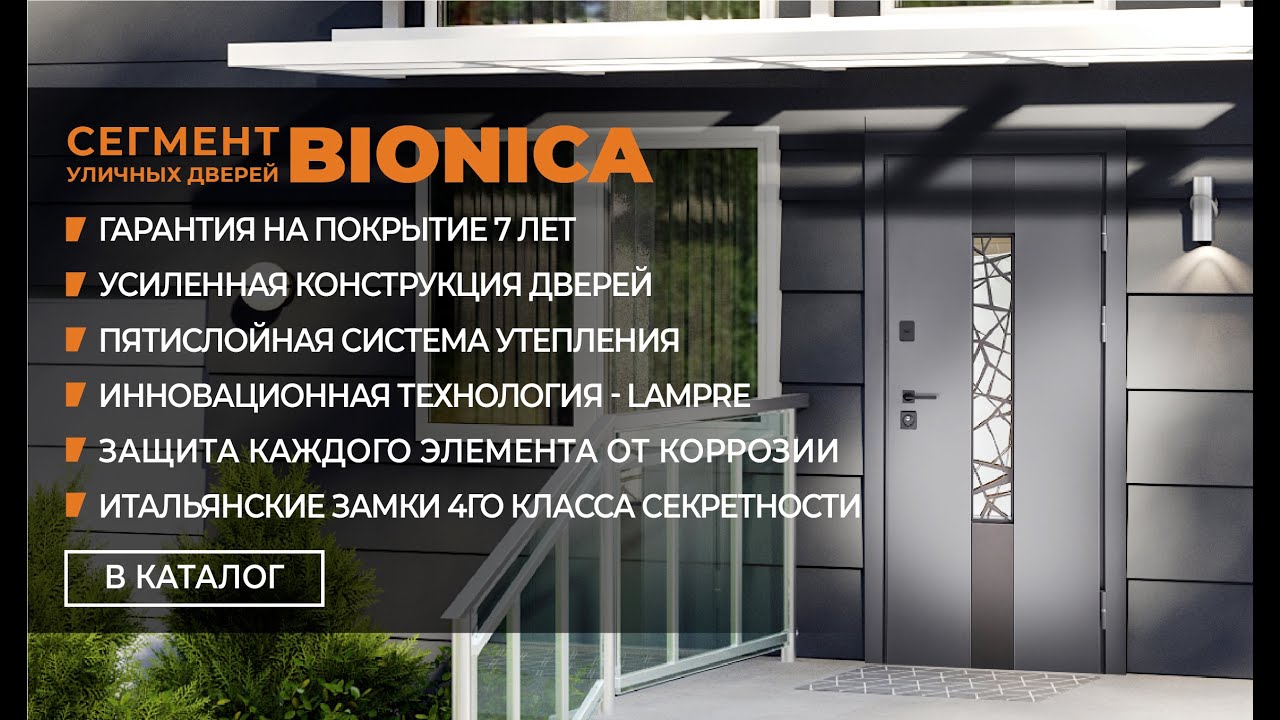 В серии дверей бионика используется новейшая разработка "Lampre". На оцинкованную сталь наносится декоративное стойкое покрытие. Антивандальная ПВХ пленка защищает дверь от перегрева на солнце и деформации при перепадах температур. Данное покрытие экологичное и долговечное, идеально защищает металл от коррозии